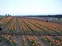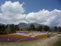 ほぼ満開! くじゅう花公園のチューリップです。 オレンジ色のチューリップが珍しかったので 撮ってみました。 この日はお天気がよくて 阿蘇五岳(写真奥)も見えます。