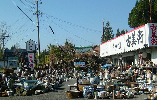 品物が店内に納まりきれず、駐車場にもあふれています。